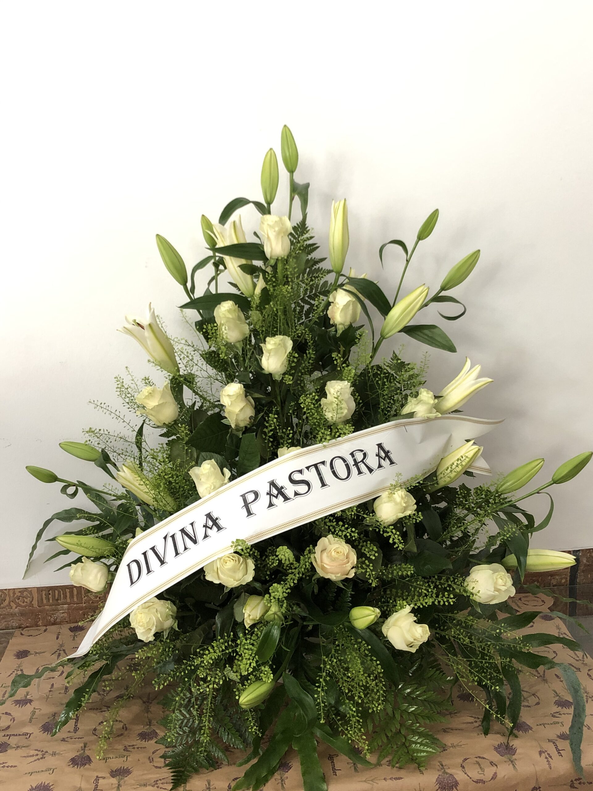 Armonioso centro floral funerario realizado con lilium, rosas y distintos verdes. Lleva cinta con el texto elegido, Colores optativos.