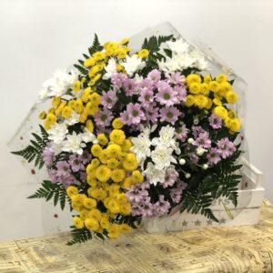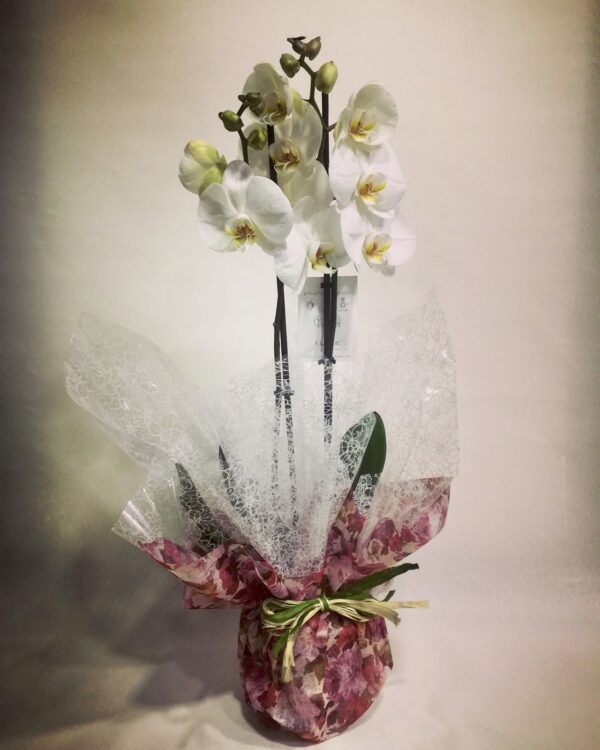 Planta de orquídea phaleonosis con dos varas de flores, adornada con papel celofan, lista para regalo.