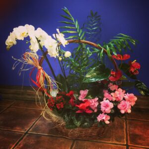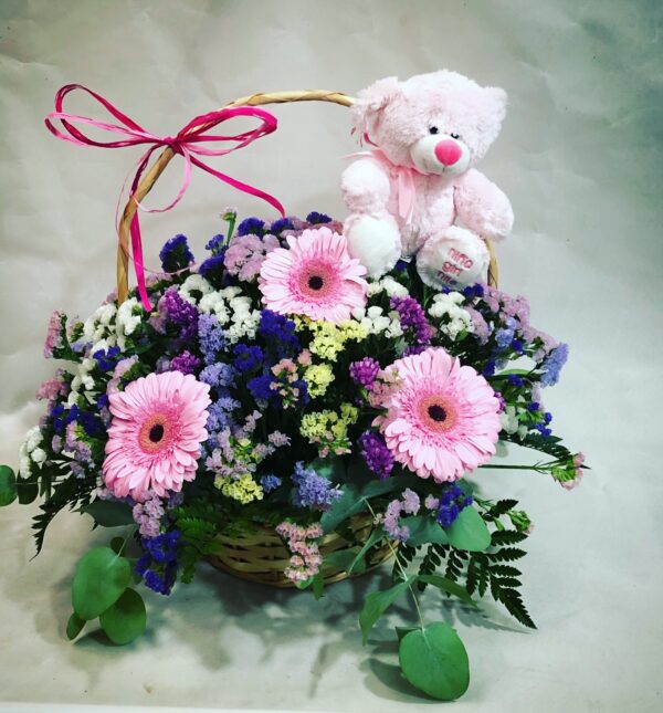 Canasta mediana realizada de flores naturales, con siemprevivas de colores, gerberas y distintos verdes, adornada con lazos de sisa y con un osito de peluche en rosa para las niñas y azul para los niños, lista para regalo.