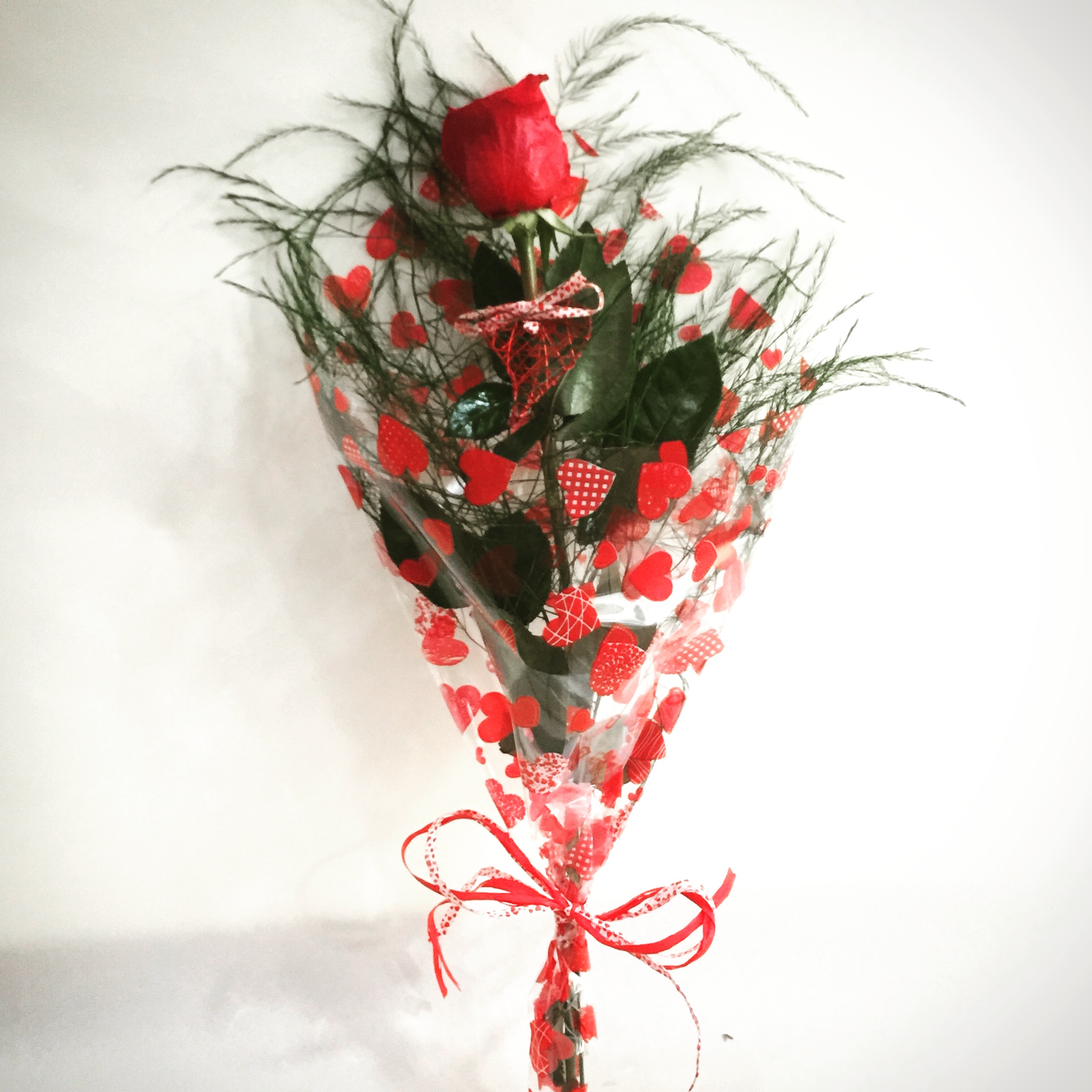 Una rosa adornada envuelta en celofán lista para regalo. Un detalle para cualquier momento.